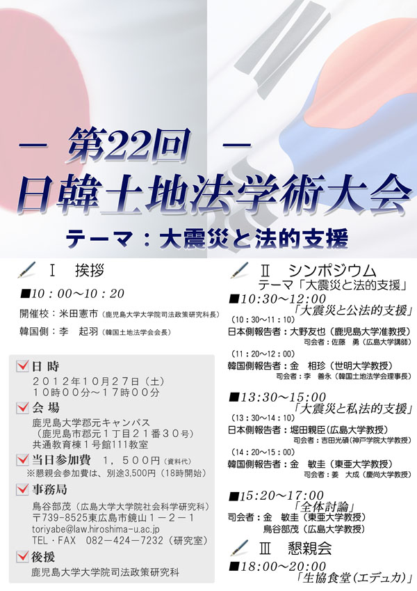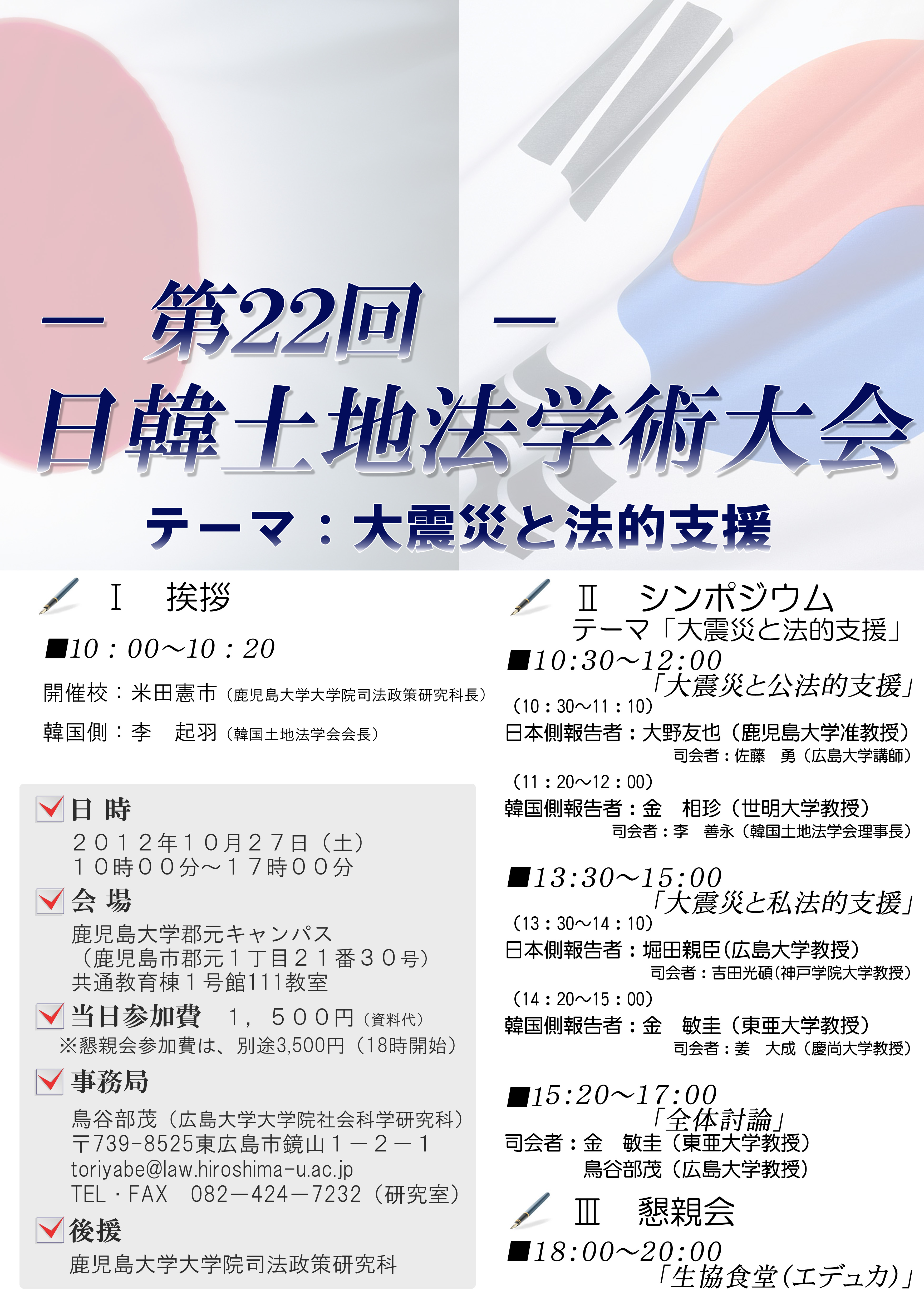 平成24年10月27日(土)、鹿児島大学において、第22回日韓土地法学会(鹿児島大学法科大学院後援)が開催されます。