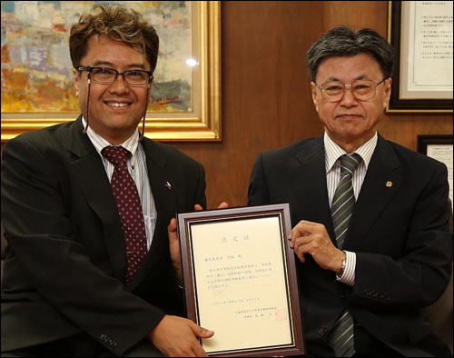 (認定書を手に、認証評価適合の報告を行う米田憲市研究科長(左)。