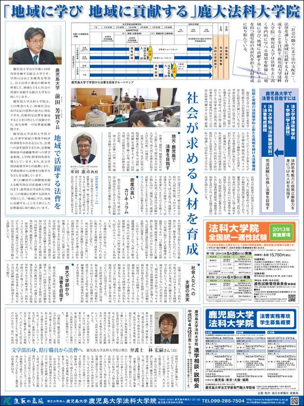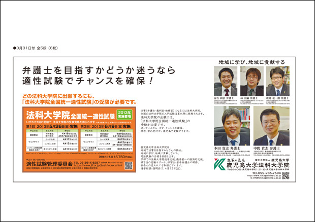 平成25年3月31日付および4月7日付の南日本新聞朝刊に、本法科大学院に関する広告を掲載しましたので、紹介いたします。