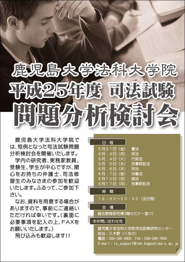 鹿児島大学法科大学院では、平成25年度司法試験問第分析検討会を下記の日程で開催いたします。